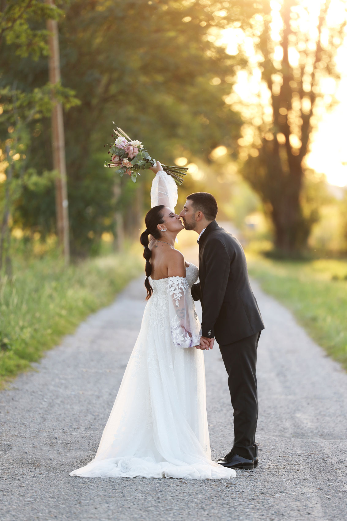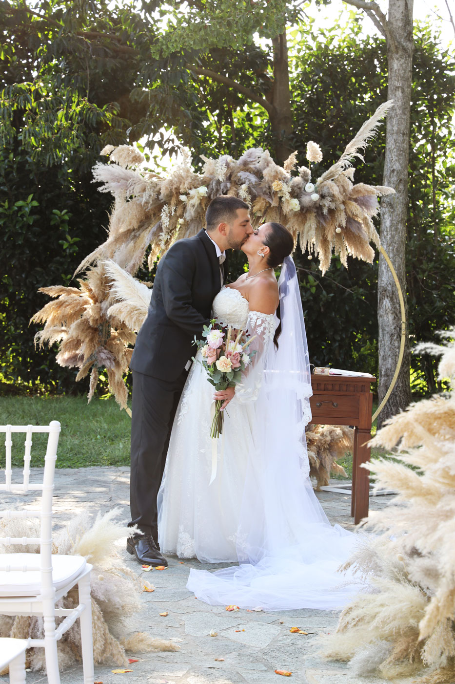 Dal rito civile tra pampas gloriose a far da cornice fino al party dopo cena (con tanto di cambio d’abito per la sposa), passando per una passeggiata in tranquillità immersi nel verde della location con il sole del tramonto a far da sfondo. Luci morbide e carezzevoli per due sposi dolcissimi e romantici.